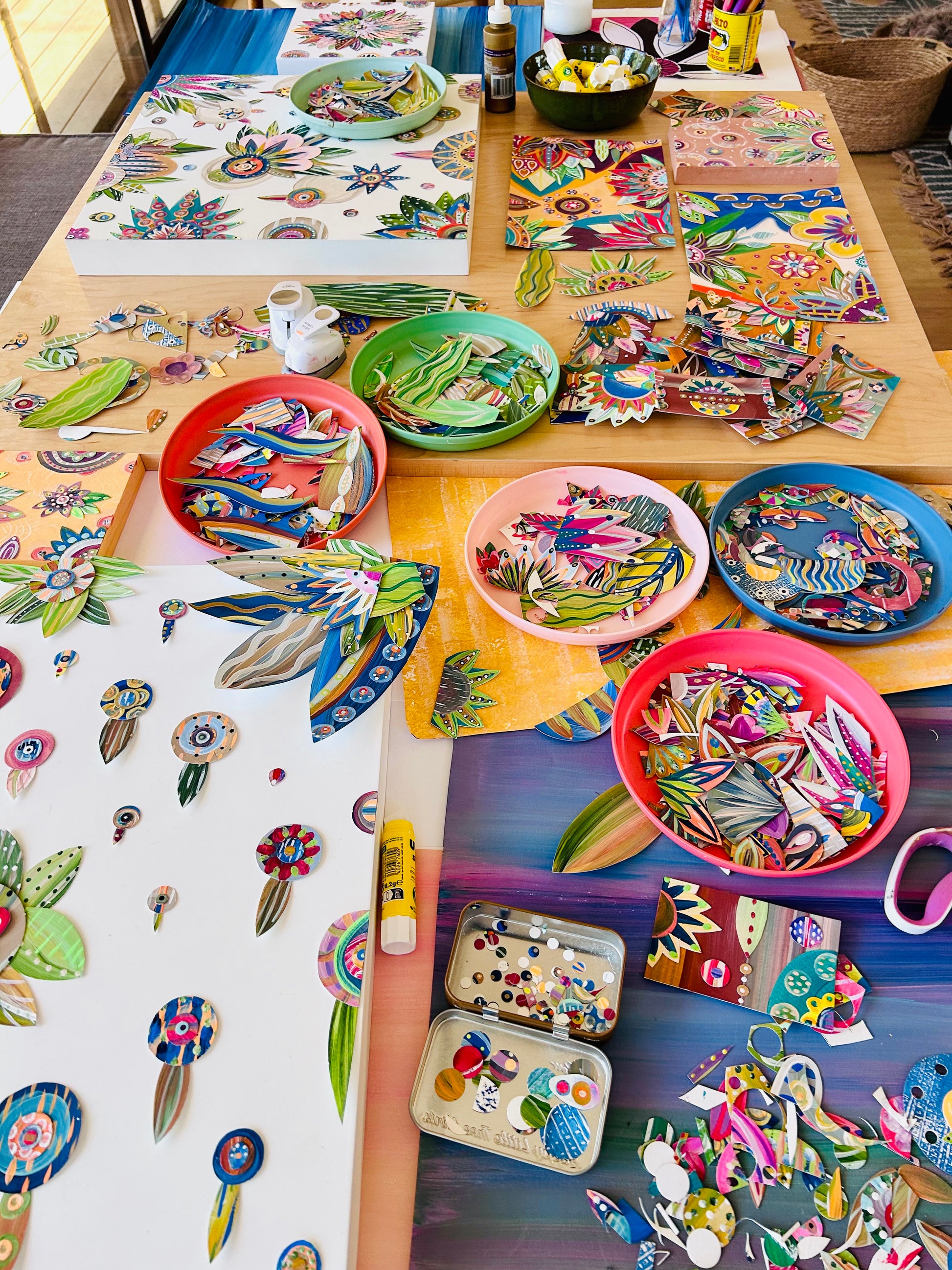 This is one of two 20 x 20 x 1.5-inch pieces featuring a stark white background adorned with soft taupe bubbles drifting among vibrant floral creations. Each individual piece of this collage wall art (or desk art) was hand-painted, meticulously mixed, matched, and carefully curated to create a tangible sense of flow. Do you feel it?