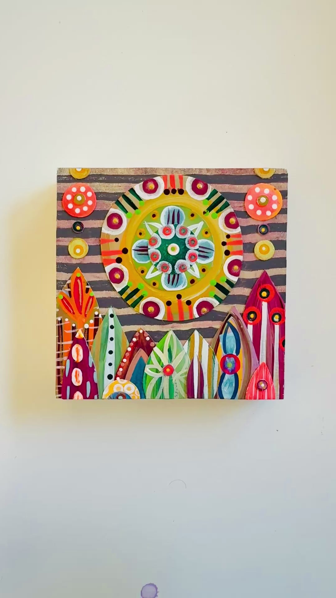 Like all of my collage work, "Patterned Sun" was created slowly and intentionally over time. Each individual piece was first hand-painted, then cut, arranged, layered, and refined into a one-of-a-kind original filled with texture, detail, and personality.